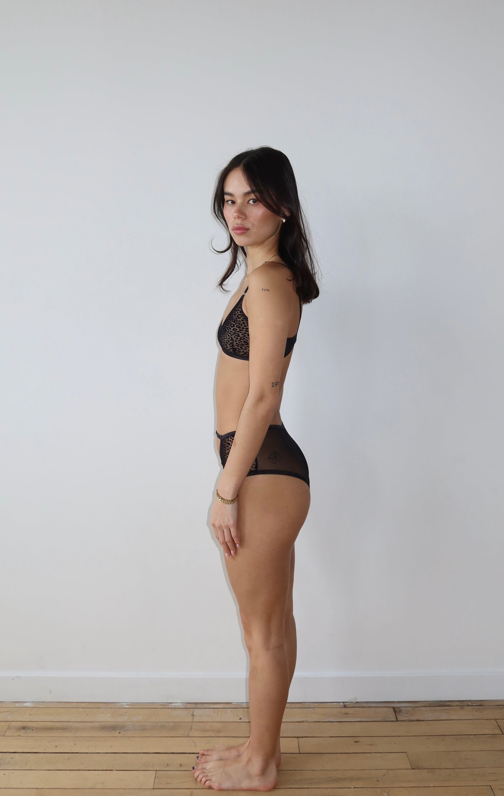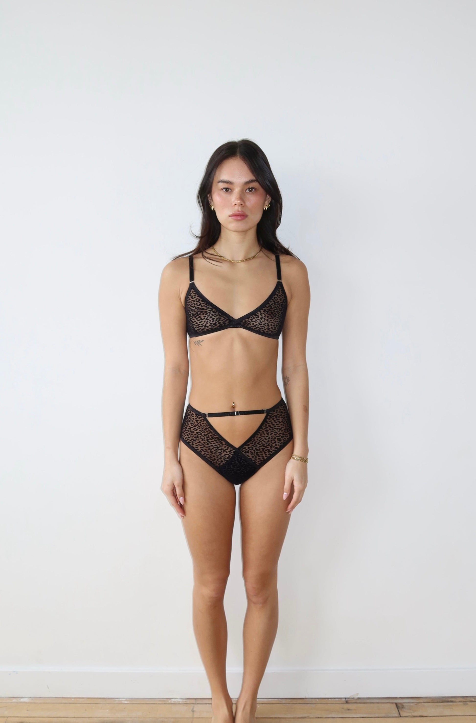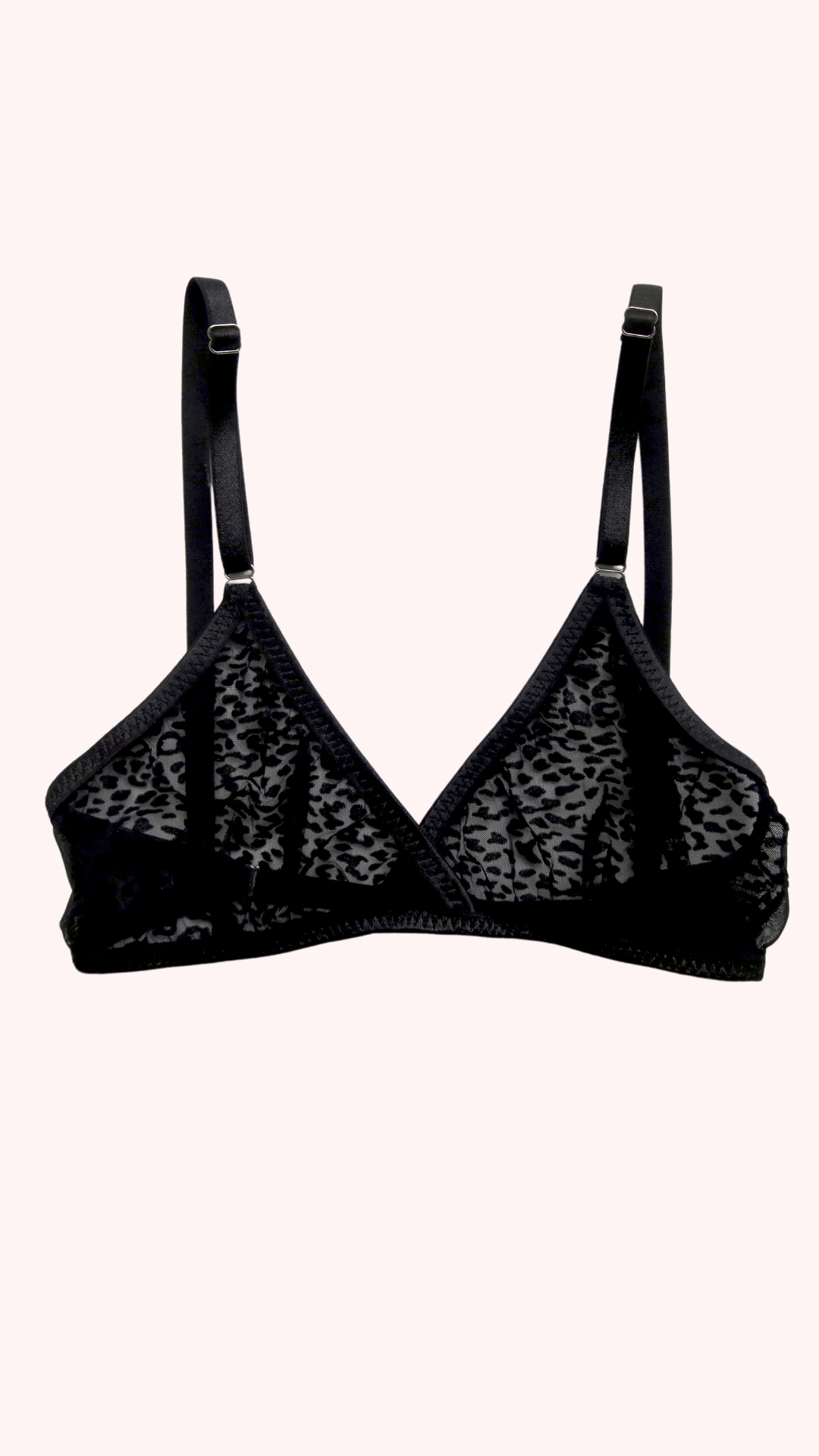 Our popular Ravello Bralette in a flocked black leopard mesh. This bralette feels amazing to the touch.