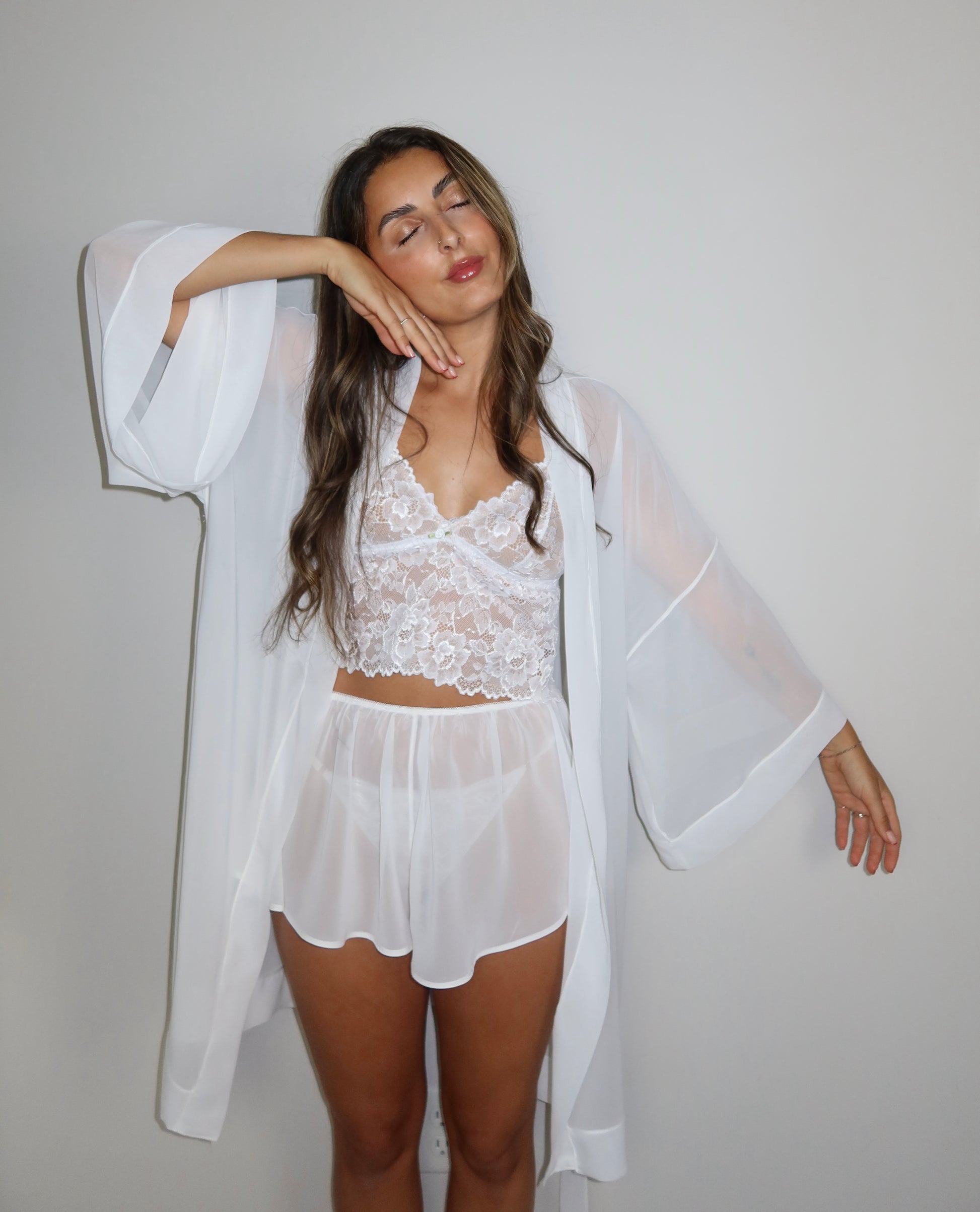 These chiffon tap shorts are made for slow mornings, honeymoon nights, or just feeling extra at home. Designed to sit mid-to-high rise with a breezy, barely-there fit.