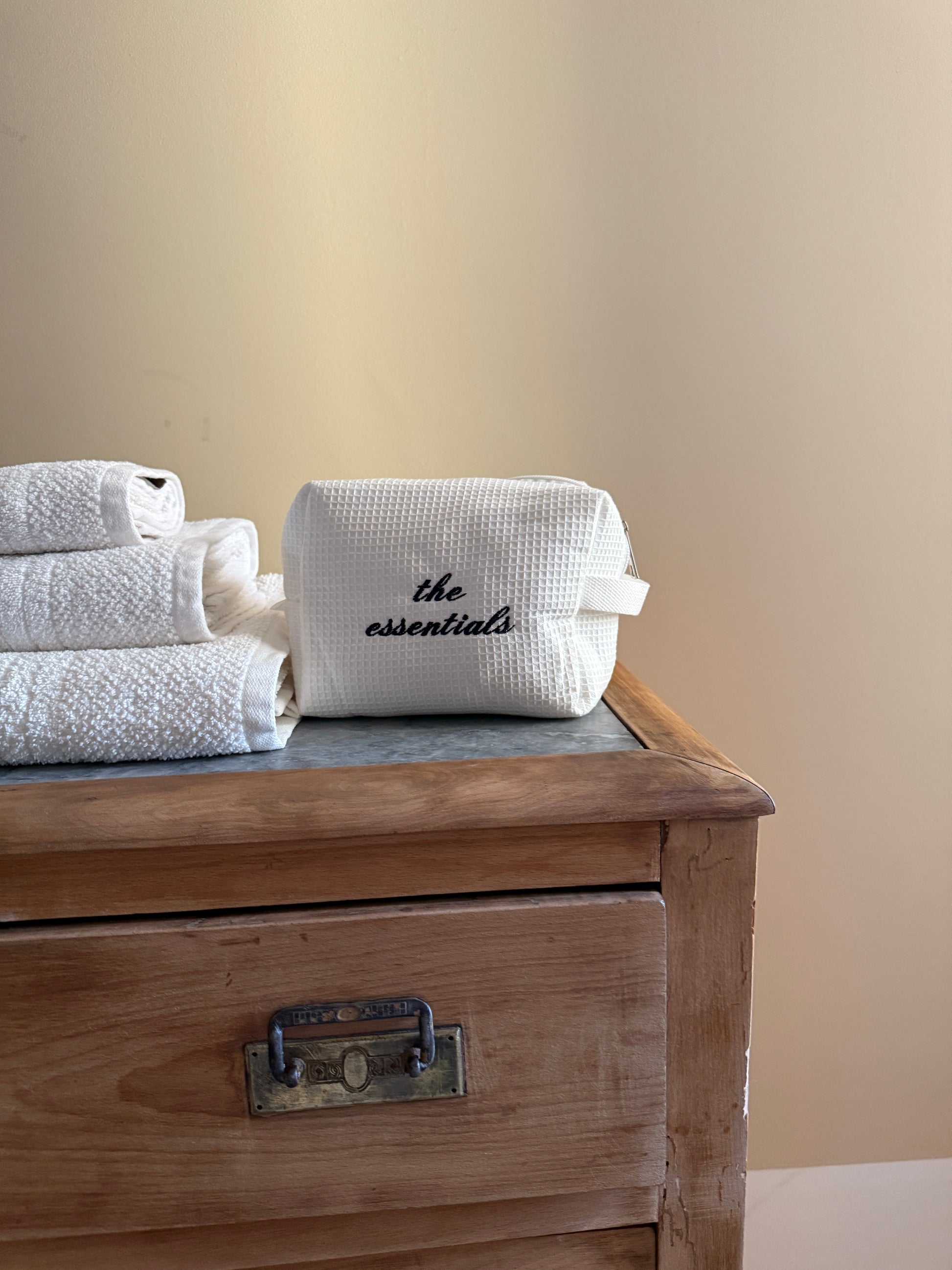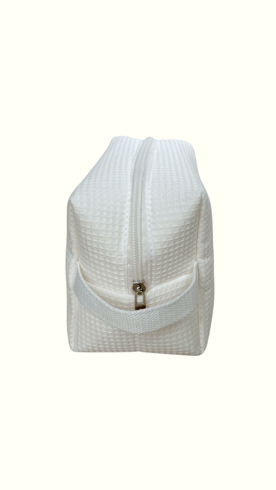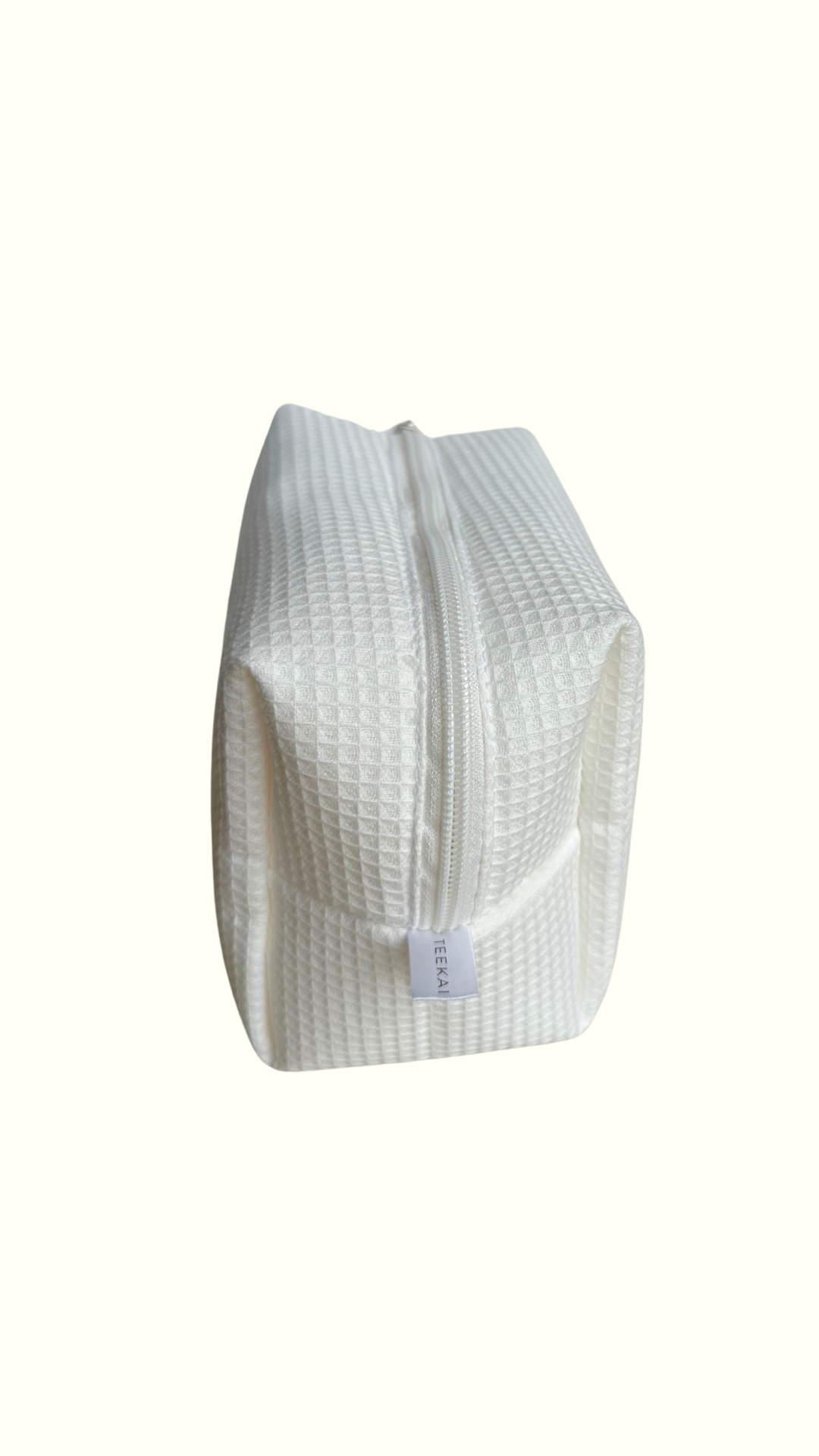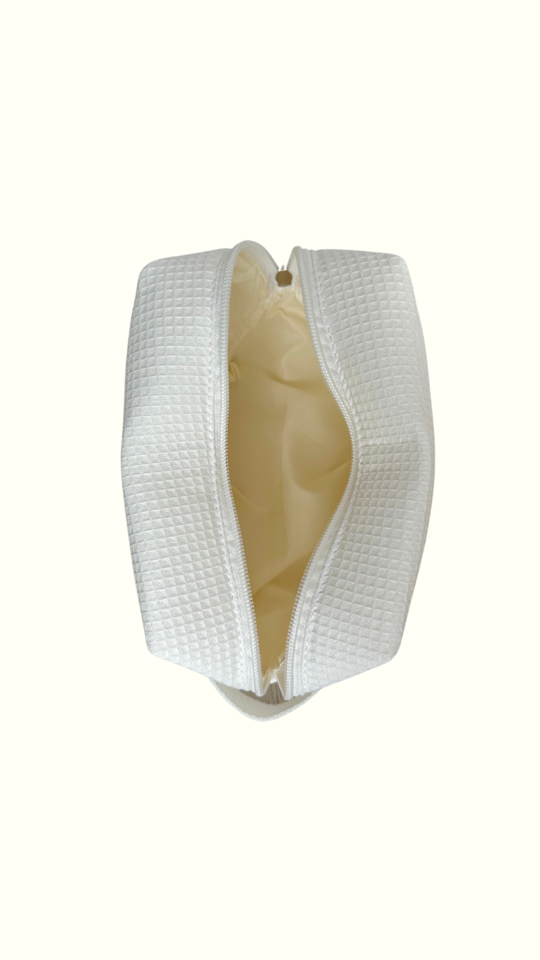 Crafted from a cream coloured soft, textured and padded waffle fabric, this pouch combines function and clean, minimalist design. The zippered closure keeps your must-haves secure, while the compact size makes it perfect your everyday essentials.