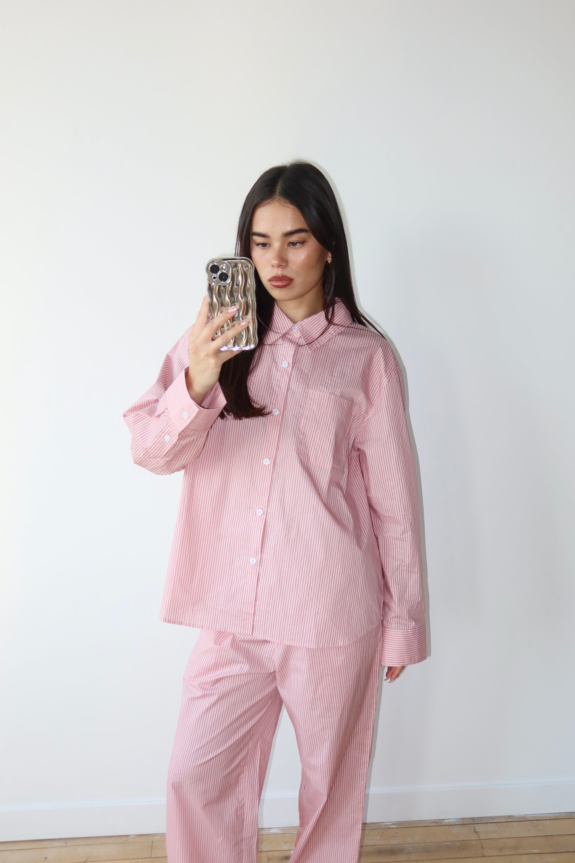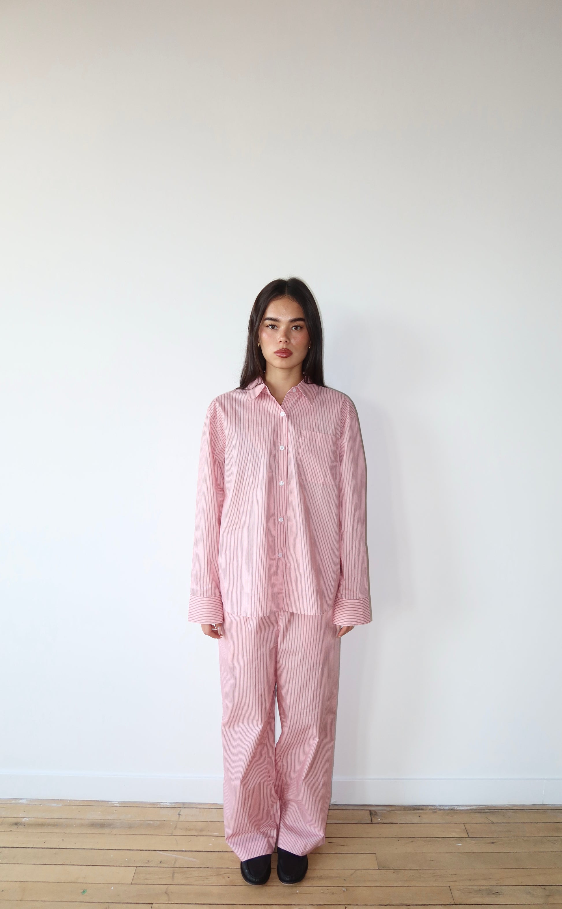 - Model wearing The Pop Shirt in S/M and M/L, and wearing the Pop Pant in S